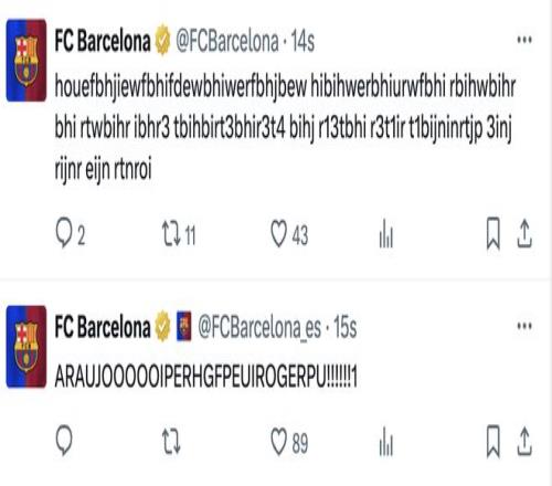 在阿劳霍破门后,巴萨官方社媒也激动到胡言乱语,接连发布了两条不明所以的长串英文字符,以表达球队的激动之情。