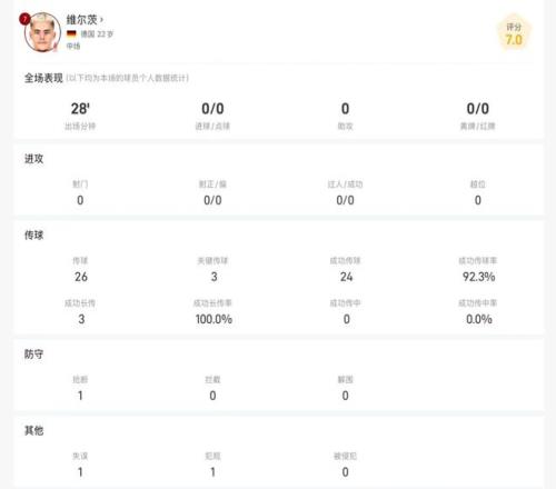 3次长传全部成功,另外有1次抢断和1次犯规。