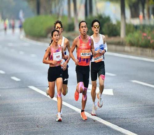 国际精英组成的第一集团出发的配速很快,黄雪梅自己以325-326配速跟了两公里后,就慢下来了,她边跑边等着从后面出发的丈夫陈志明追上来。随后,俩人以330左右的配速并肩前行。