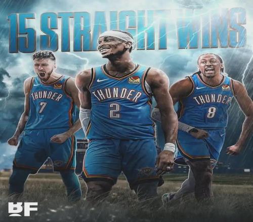 雷霆23胜1负追平1969-70赛季的尼克斯,NBA开季24场的历史第二战绩。雷霆接下来10个对手分别是:太阳、快船、森林狼、灰熊、马刺(连打两场)、76人、老鹰、开拓者和勇士。只要雷霆正常发挥,25连胜并非遥不可及。