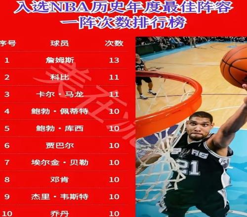 最佳一阵是NBA常规赛个人荣誉的顶级象征,代表着球员在当赛季的表现处于联盟顶级水平。詹姆斯的职业生涯中,累计获得了13次最佳一阵,远超排名第二的科比和马龙(均为11次),成为NBA历史上获得最佳一阵次数最多的球员。