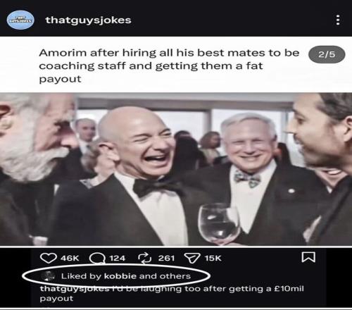 在曼联解雇前任主帅鲁本·阿莫林之后,20岁的英格兰中场科比·梅诺在社媒点赞了一条嘲讽阿莫林贪财的帖子。该网文嘲讽阿莫林带着自己的教练组到曼联,然后主动造成被解雇,以便得到丰厚的补偿。