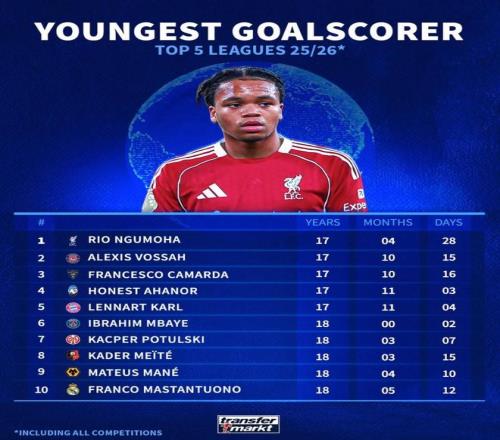 北京时间1月28日,德转统计出了本赛季至今欧洲五大联赛俱乐部最年轻的10位进球球员,利物浦的新星恩古莫哈以17岁4个月28天排名第一,伦纳特-卡尔、卡马尔达、易卜拉欣-姆巴耶以及马斯坦托诺上榜。