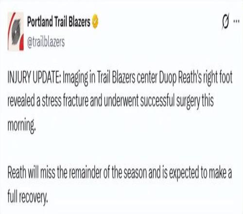 开拓者伤情更新!里斯接受右脚手术赛季报销两大后卫接近复出