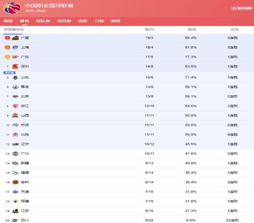 CBA打到现在,排名前3的队伍分别是广厦19胜3负,上海18胜4负,广东17胜5负,上海和广东之间的差距只有1场,咬的很死,谁都有登上第1的可能!